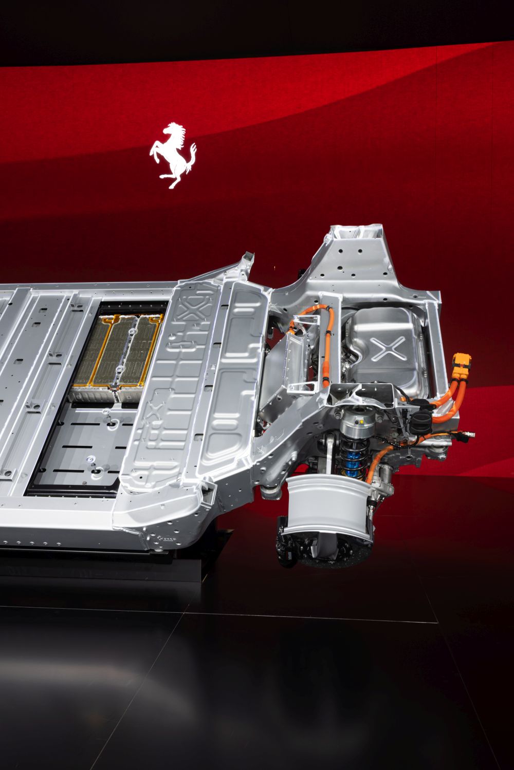 Bateria are o capacitate foarte mare, de 122 kWh, utilizează o chimie NMCA și este formată din 15 module: 13 module sunt situate în podea (6 perechi de două module și unul separat) și două module în spatele scaunelor. Ferrari a ales această soluție pentru a nu mări foarte mult ampatamentul dar și pentru a obține o distribuție a maselor care să simuleze comportamentul unei mașini cu motor central. Astfel, distribuția maselor este de 47-53% față spate și datorită faptului că 85% din masa bateriei este concentrată în podea, centrul de greutate este cu 80 mm mai coborât decât la o Ferrari tradițional cu motor termic. Fiecare modul este format din 14 celule, densitatea de energie a celulelor fiind de 305 Wh/kg.