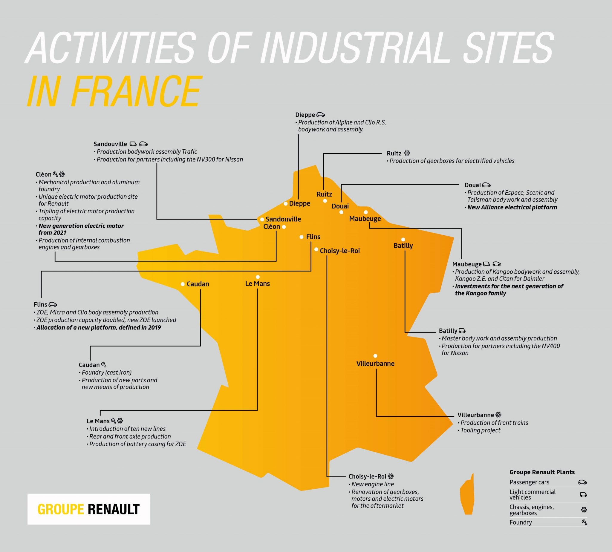 Ne mutăm în Franța, unde Grupul Renault a dezvăluit recent intenția de a transforma Franța într-un centru de excelență pentru vehicule electrice – nu doar ale Renault, ci inclusiv ale alianței Renault-Nissan-Mitsubishi. Conform planului strategic „Drive The Future”, grupul francez va investi peste un miliard de euro pentru dezvoltarea și producția automobilelor electrice în hexagon. Mai exact, compania intenționează să introducă o arhitectură electrică complet nouă la fabrica din Douai, utilizabilă la nivelul întregii alianțe și produsă la a doua locație pentru modele Renault din țară. Centrul de producție de la Flins va rămâne singura locație de producție a modelului Zoe, aici urmând să fie construită și noua generație – cu planuri pentru dublarea capacității de producție. La situl din Cleon – unde se produc motoare electrice – capacitatea va fi triplată, din 2021 urmând să fie produsă o nouă generație a sistemului de propulsie EV. Nu în ultimul rând, la Maubeuge se vor face investiții pentru producția viitoarei generații a familiei Kangoo, aici fiind inclusă și versiunea complet electrică Kangoo Z.E.