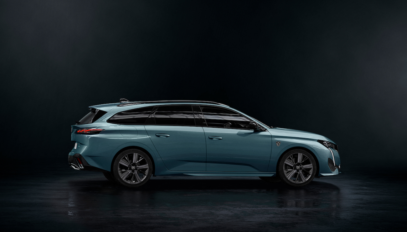 Noul model francez, așteptat după prezentarea hatchback-ului, vine cu același limbaj de design, dar partea din spate este desenată sportiv pentru un break, cu un aspect chiar agresiv. Mai ales liniile de pe aripile spate și, în afara eleronului integrat de deasupra hayonului, a apărut și o nervură asemănătoare deasupra liniei stopurilor. Partea din față este cea de la fratele hatchback și se remarcă noul logo Peugeot, care maschează radarul sistemelor de asistență. Farurile sunt cu tehnologie Eco LED, dar la versiunile GT și GT Premium acestea sunt înlocuite cu unele mai performante: Matrix LED.