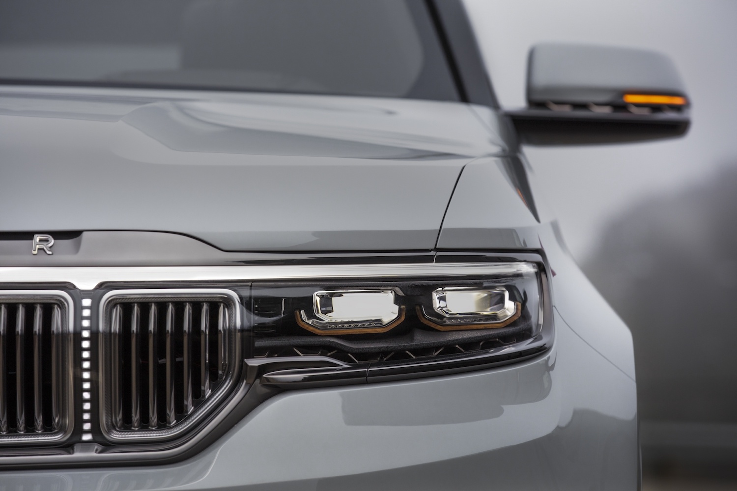 Farurile înguste, cu tehnologie LED, fac corp comun cu grila compusă din 7 elemente tipice grilei tradiționale Jeep, doar că în acest caz este mult mai îngustă. Spatele este tăiat drept, cu stopuri mici în comparație cu masivitatea mașinii, ale căror linie de LED-uri merge până aproape de centrul hayonului. Încadrarea lunetei, dar și a geamurilor laterale într-o ramă solidă, vizibilă, aduce aminte de modelul inițial. Americanii au. o adevărată obsesie pentru jantele mari, așa cu Jeep Grand Wagoneer rulează pe unele de 24 inch.