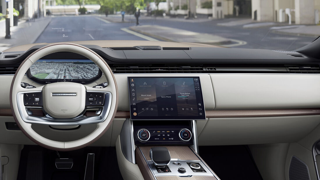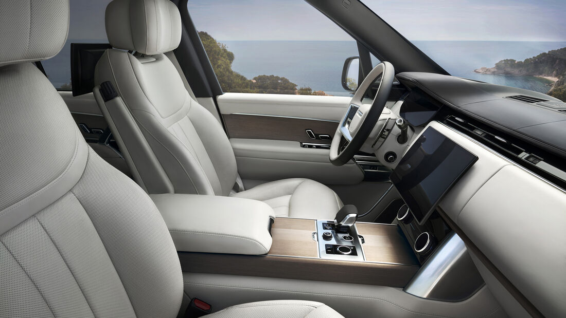 Nu este chiar surprinzător că există mai mult spațiu în fiecare direcție, nu-i așa? Noul Range Rover joacă și cartea luxului în față. Șoferul și pasagerul din față se simt confortabil pe scaunele generos dimensionate. Finisările din piele și lemn creează o atmosferă confortabilă și în același timp de top. Tabloul de bord nu este poziționat prea sus și astfel asigură o vedere bună și o atmosferă relaxată celui de la volan. Ecranul tactil ușor curbat al sistemului de infotainment numit „Pivi Pro” arată în continuare un mod demo în prototip pentru a afișa afișajele de înaltă rezoluție. La prima vedere, structura de operare nu diferă de cea din alte modele actuale ale mărcii britanice.
