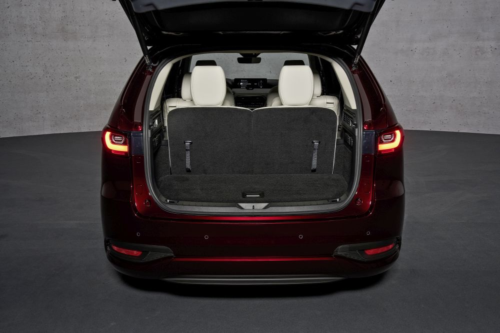 În timp ce la CX-60, spătarul banchetei se înclină la 24 sau 28 grade, la CX-80, bancheta spate este culisantă pe distanța de 120 mm iar spătarul se înclină la orice unghi între 15 și 33 grade. Mazda declară că spațiul la umeri pe rândul al doilea este de 1.476 mm (+35 mm față de CX-60), iar înălțimea interioară pe al doilea rând este de 996 mm (+12 mm față de CX-60). Pe rândul al treilea pot lua loc persoane de până la 1,70 m înălțime.