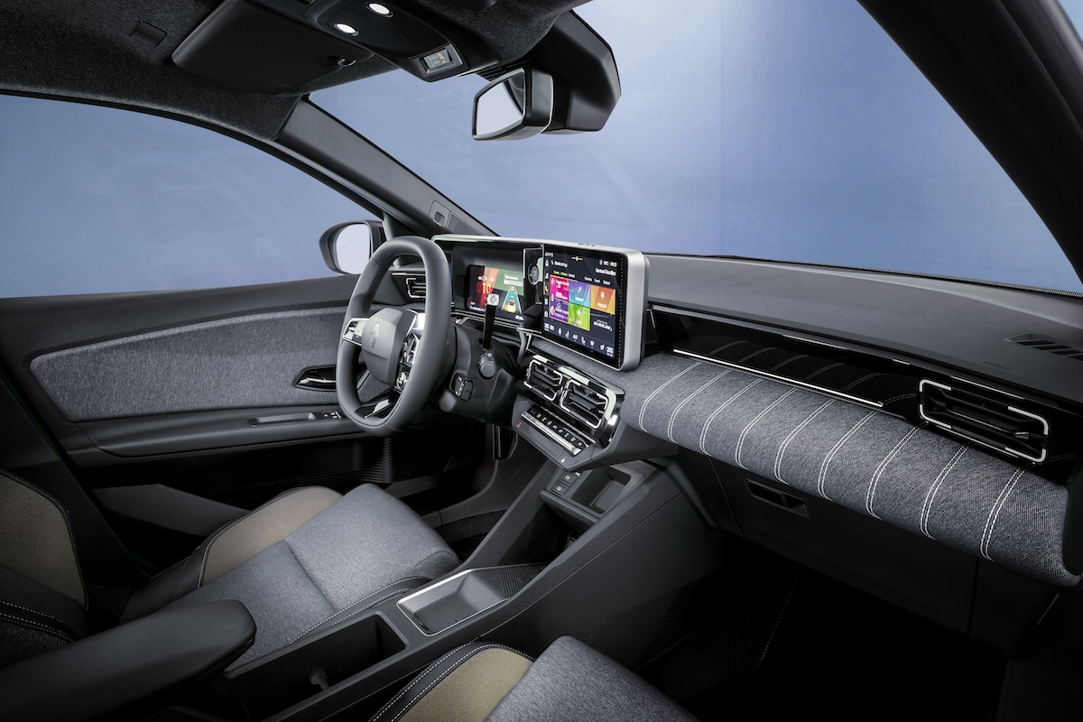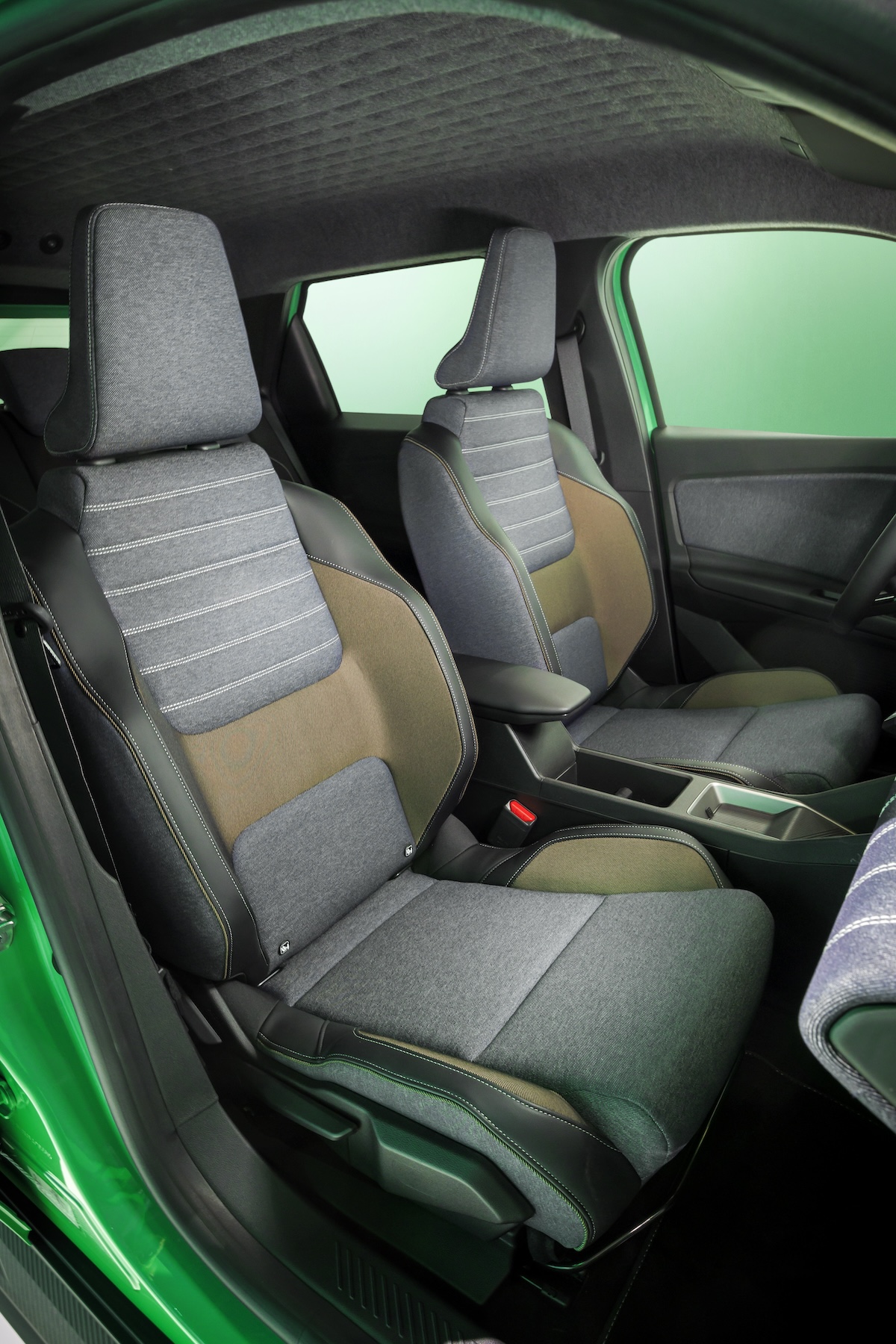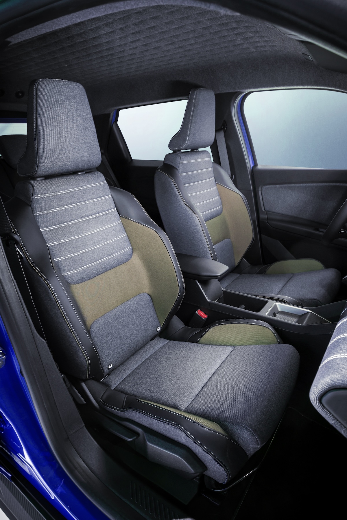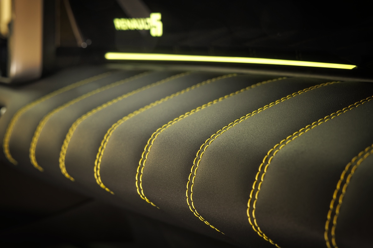 Cam așa ai putea descrie interiorul. Primul lucru care îți atrage atenția sunt scaunele. Tapițate în denim, pe care-l găsim nu doar pe saune, ci și pe panourile portierelor și pe planșa de bord (la nivelul intermediar de echipare, Techno). Acest material este obținut, spune Renault, în proporție de 100% din sticle din plastic reciclate. La fel și tapițeria gri cu galben a versiunii Iconic Cinq. Am lăsat la final ce este mai bun. Scaunele față sunt inspirate de cele ale modelului Renault 5 Turbo (1982). Pe lângă faptul că arată foarte bine (sunt cumva în forma literei H), oferă o susținete laterală excelentă.