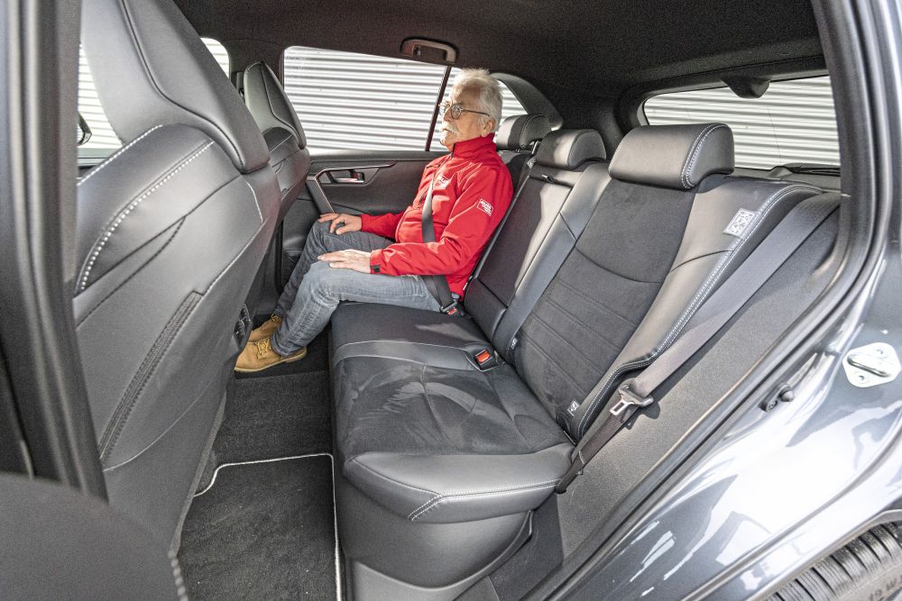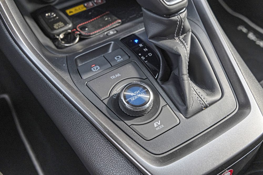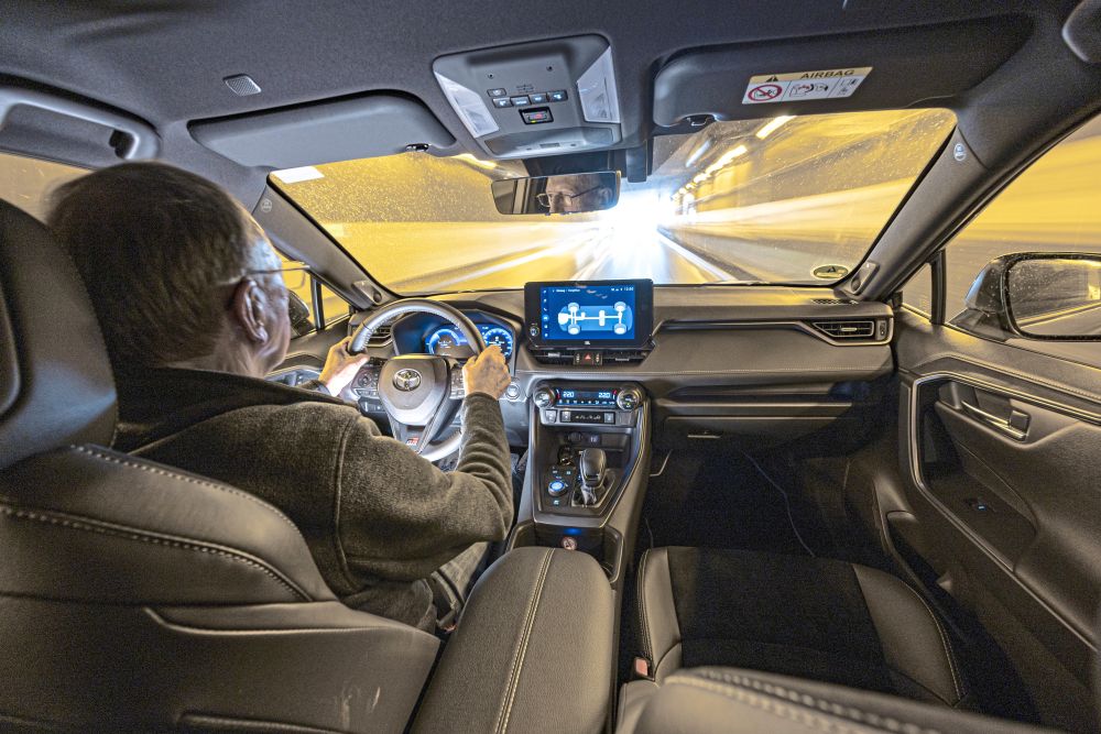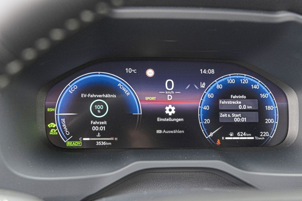 Există chiar și un buton EV pentru acest lucru – fapt rar întâlnit la hibrizii clasici –, astfel încât, în cel mai bun caz, poți parcurge aproximativ 100 de metri în mod pur electric (capacitatea bateriei aproximativ 1,5 kWh). Dacă apeși mai tare pedala de accelerație, motorul electric numărul 2 (40 kW), de pe puntea din spate, intră în funcțiune, transformând modelul Toyota RAV4, lung de 4,60 metri și greu de 1720 kg, într-un vehicul cu tracțiune integrală, care, în test, a avut nevoie de doar 6,9 litri de benzină pentru 100 km.