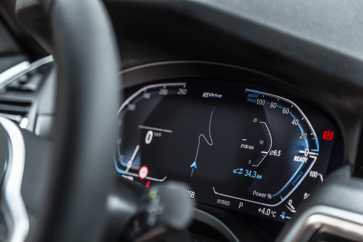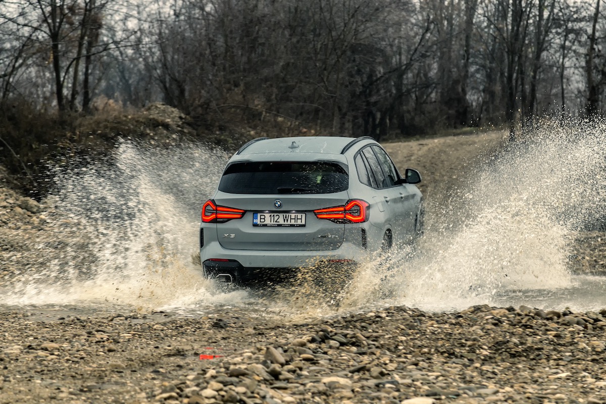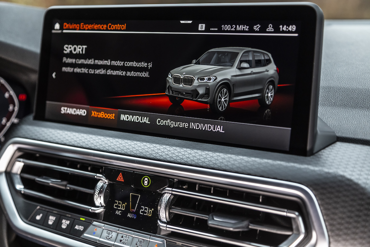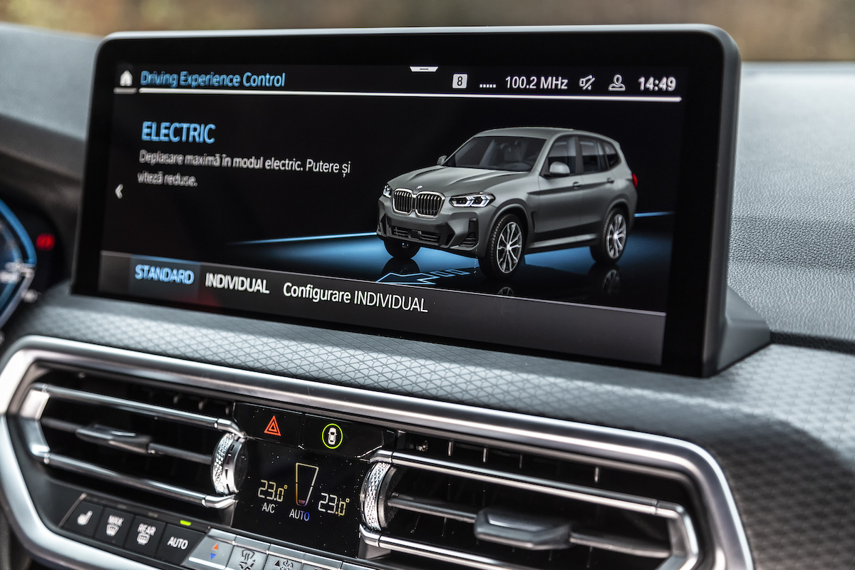 Nimic nu s-a schimbat la nivelul sistemului de propulsie. BMW X3 xDrive30e mizează pe același motor de 2 litri, care produce 184 CP, asistat de un motor electric de 109 CP, plasat în carcasa cutiei de viteze automate cu opt trepte. În total, 292 CP și 420 Nm. Bateria are aceeași capacitate brută, 12 kWh, dar cea netă a crescut puțin, ajungând la 11,2. Teoretic, mașina ar putea rula 49 km doar cu propulsie electrică, dar, în cazul nostru, la cam 5 grade Celsius, a parcurs 34, în condițiile în care am mers mai puțin în oraș și mai mult în afara lui, cu viteze de 90–100 km/h. Pentru că am folosit modul hibrid, motorul termic a intrat la câteva accelerații mai serioase, astfel că, la finalul celor 34 km, am avut și un consum de benzină, de 2 l/100 km. În modul electric, viteza maximă este de 130 km/h, iar în modul hibrid, doar 110. Bateria se încarcă complet în cam 6 ore la o priză normală, absolut suficient dacă o poți încărca în fiecare noapte. Modul în care lucrează sistemul, chiar și după epuizarea bateriei menține consumurile pe la 7 l/100 km în afara orașului, la viteze mari și cam 5 l/100 km în oraș. Sigur, poți reîncărca bateria la 100% în timpul mersului, pentru a putea conduce electric în oraș, dar vei vedea asta în valorile consumului de benzină.