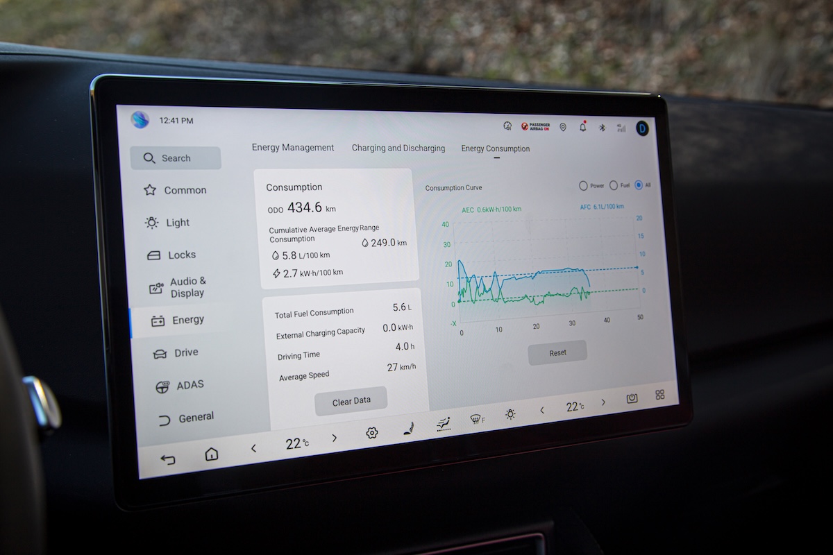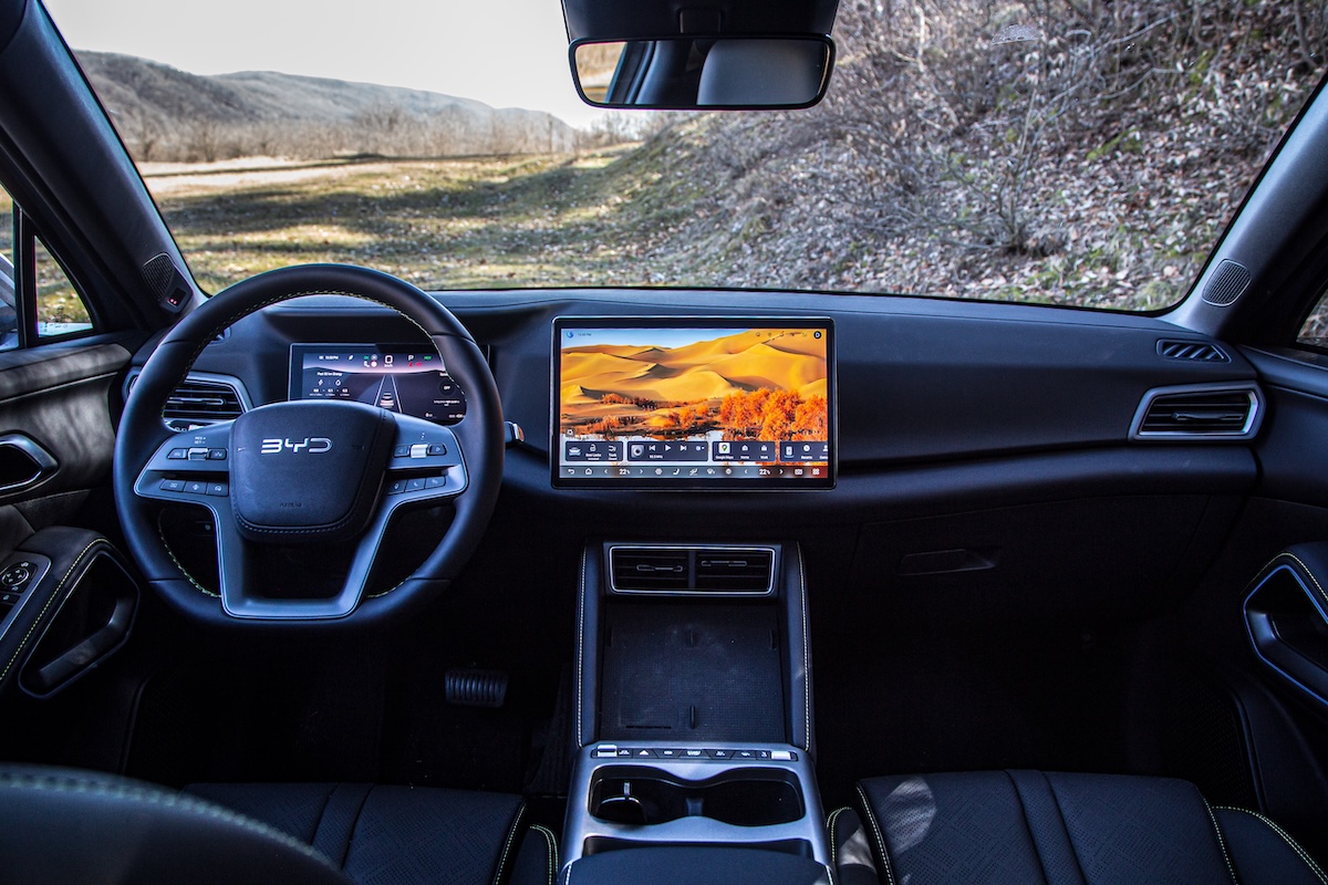 Scriam mai sus că europenii ar trebui să-și ia notițe când vine vorba de unele sisteme plug-in ale producătorilor chinezi. Până să conducem toate aceste mașini chinezești, știam o singură rețetă, cea a europenilor: motor termic, motor electric nu foarte puternic, baterie. Mergi electric până epuizezi bateria și apoi consumul este de motor termic, care are de cărat o masă suplimentară. BYD propune altceva. Un motor termic nu foarte puternic, de 1,5 litri și 98 CP, dar un motor electric de 197 CP. Pentru clasa mașinii, este foarte mult. Mai ales că sistemul lucrează altfel. Cel mai scăzut procentaj al bateriei pe care l-am văzut în cele trei zile de test a fost de 18%. Practic, nu te lasă să descarci bateria, pentru că altfel ar crește prea mult consumul de benzină. Și are logică, pentru că motorul termic, deși participă la propulsie, este lăsat în plan secund. Motorul electric este cel care încearcă (și reușește) să antreneze cât mai mult puntea față. Și din asta se desprind două lucruri evidente. Da, vorbim despre un SUV cu putere totală de 212 CP și chiar îi simți, pentru că reacțiile la accelerare sunt de mașină electrică, foarte prompte, pentru că motorul electric este în prim-plan. Apoi, consumul de benzină este stabil, undeva la 5 l/100 km, chiar și după ce se termină bateria, despre care v-am spus că nu se termină… așa că autonomia totală a mașinii ajunge aproape de 1.000 km. Apropo de consum, Atto 2 DM-i face un lucru interesant: calculează consumul de benzină chiar și când rulezi electric sau în modul hibrid. Știați că 14,2 kWh/100 km ar însemna, de fapt, 4,1 l/100 km? Genul ăsta de calcule îl vezi pe tabloul de bord, ceea ce te ajută la perceperea unitară a eficienței mașinii.