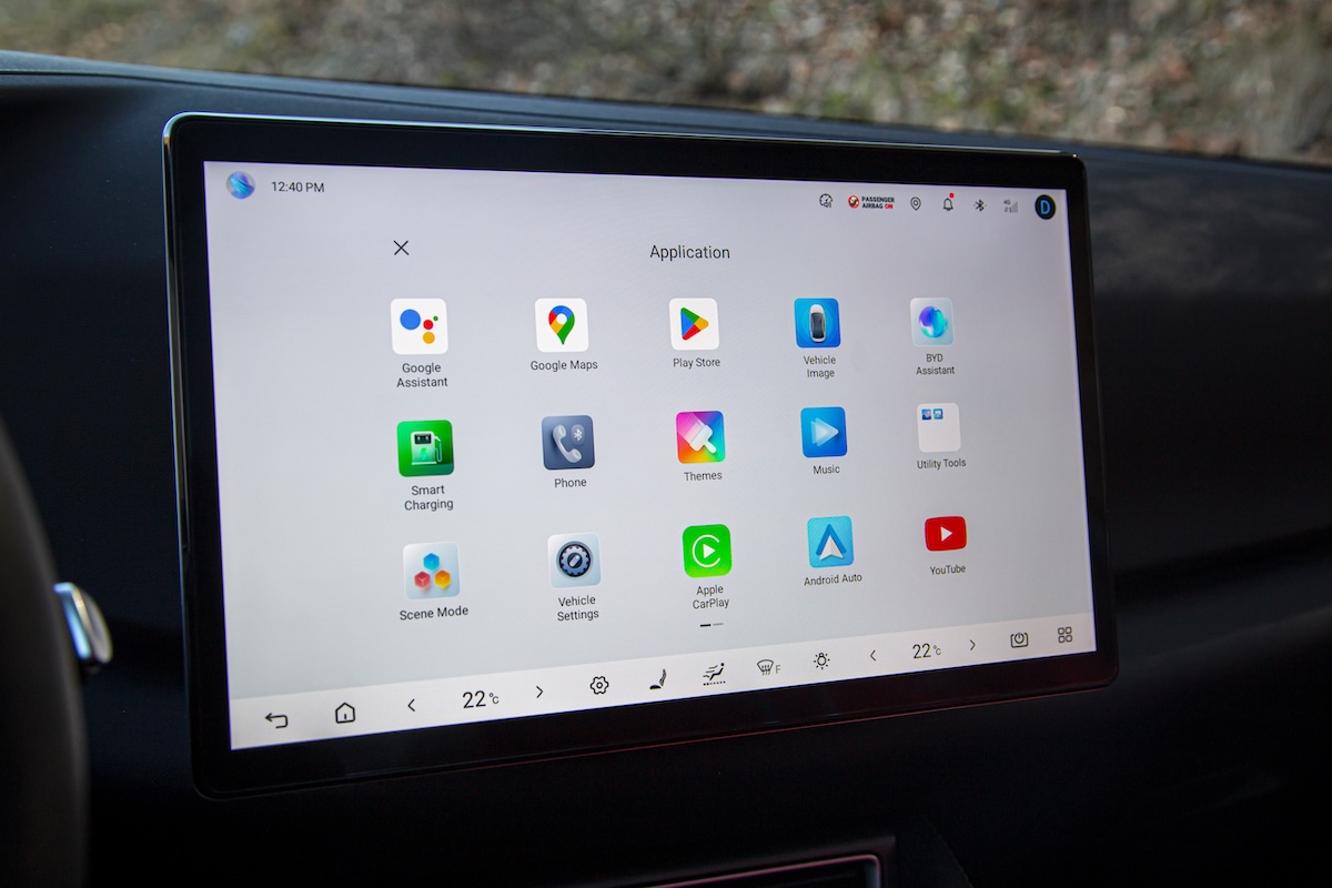 Am condus modelul Seal U DM-i acum câțiva ani, când BYD nu era prezent pe piața din România, și îmi amintesc că am remarcat interiorul. Mai precis, planșa de bord, cu display central rotativ. Practic, schimbi aspectul planșei de bord: ai display vertical sau orizontal. Ei bine, Atto 2 DM-i nu mai oferă această funcție, display-ul central de 12,8 inchi fiind fixat în poziție orizontală. Inițial, am crezut că acest display rulează un soft făcut pe baza Android Automotive, dar nu. În timp ce europenii produc softuri dedicate, unele pe platforma Google, cu costuri destul de mari, BYD a ales calea pragmatismului: producătorul chinez a luat o tabletă cu sistem de operare Android și a adaptat-o la funcții și meniu dedicate mașinilor. Rezultatul este că ai toate funcțiile Google built-in și mai poți descărca și altele. Este adevărat că meniul este complex, cu foarte multe funcții, nu ai cum să-l înveți rapid, ci trebuie să-l studiezi puțin, după care totul devine simplu și natural. Widget-urile grupate în partea de jos sunt exact ce trebuie pentru accesarea celor mai importante funcții, iar linia de la bază conține opțiunile pentru climatizare, iar acest meniu digital nu este dublat cu butoane fizice. Ce mai găsești pe display-ul central? Conectivitate la internet, Apple CarPlay și Android Auto wireless, asistent vocal Google, dar și asistent dedicat de la BYD. Consola este foarte curată, are un singur rând de mici butoane fizice, în rest spații generoase de depozitare și cea mai bună poziție pentru încărcarea wireless a telefonului.