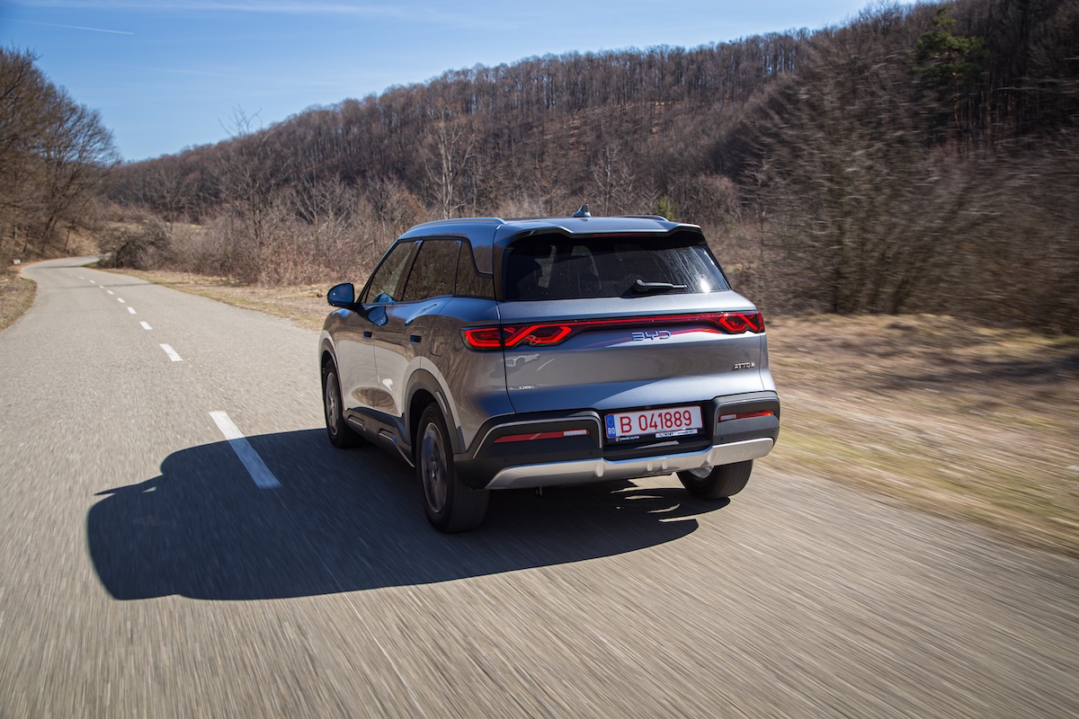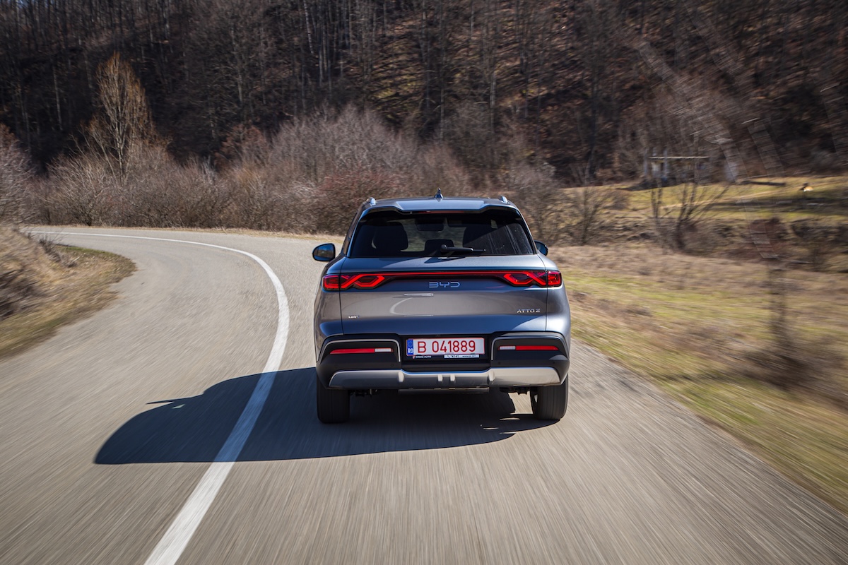 Constructorul chinez a setat platforma pentru confort, este evident, suspensiile lui Atto 2 DM-i iartă destul de multe feluri de gropi în asfalt, dar a fost păstrată o rezervă importantă și pentru stabilitate: cu modul Sport cuplat (motorul termic are un rol mai important acum), poți merge alert fără ca suspensiile să pară depășite de situație, iar transferul de mase este fluid și îți dă încredere. Limita de subvirare am descoperit-o mai sus decât m-aș fi așteptat.