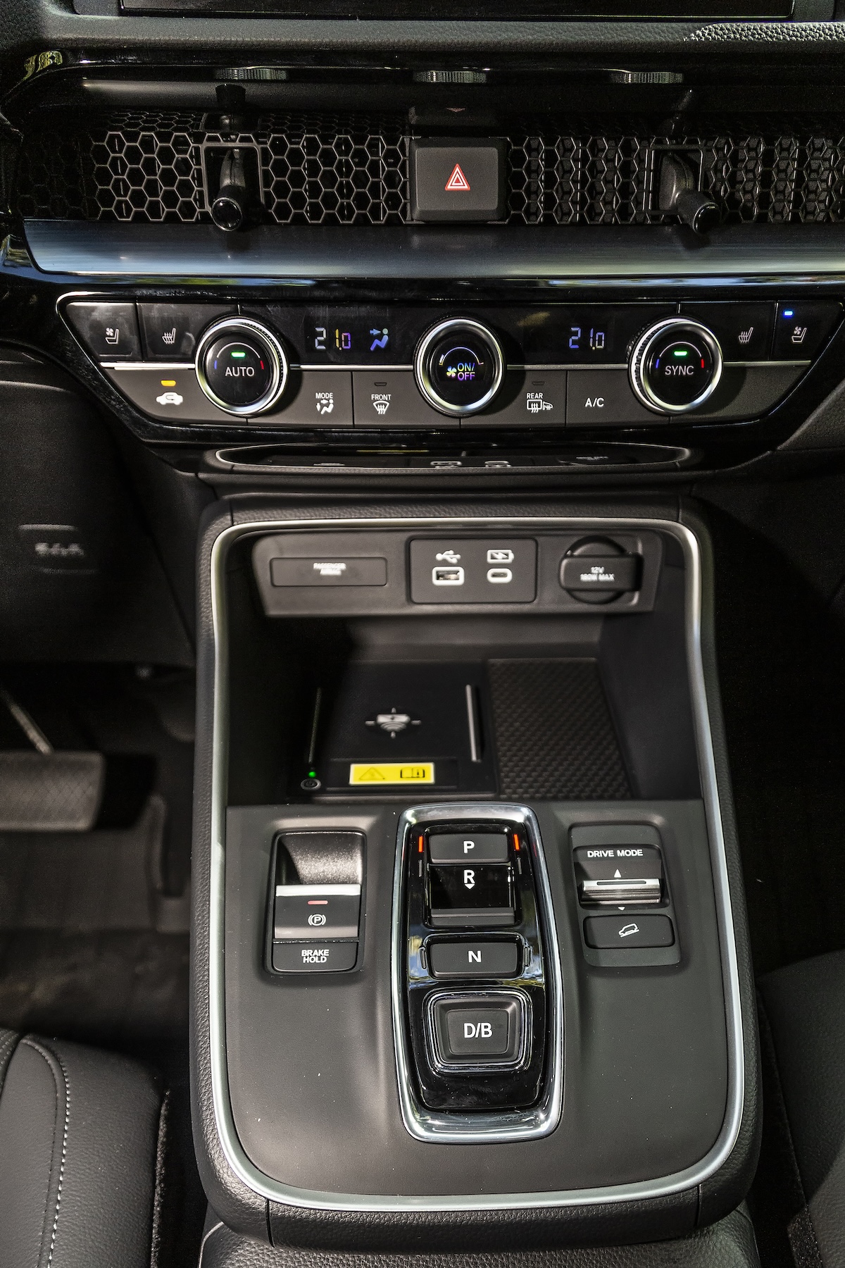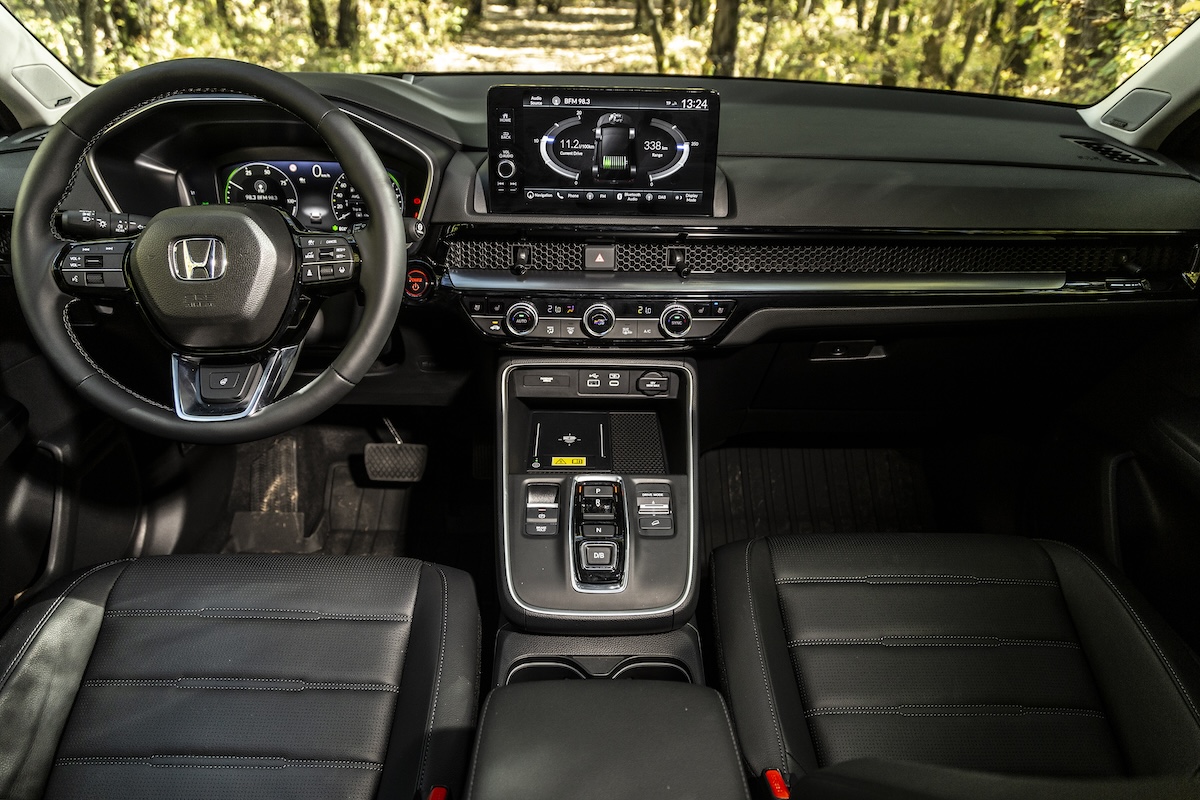 La interior, totul s-a schimbat, dar te obișnuiești repede cu noua planșă de bord. Este mai simplă, mai atractivă, aproape identică cu a noilor modele Civic, HR-V și Z-RV. Tabloul de bord digital de 10,2 inchi este exact ce trebuie, cu informații afișate clar, bine structurate, dar fără a fi deosebit de configurabile – sunt anumite modificări de structură și culori la selectarea celor trei moduri de condus. Honda nu a făcut experimente inutile, ci a păstrat comenzile clasice, cu butoane fizice pe volan și pe sistemul de control al climatizării. Dsiplayul central are 9 inchi, dar pare potrivit modei de-acum cel puțin 3 ani. Este mic, cu butoane clasice pe o parte, iar pictogramele meniului sunt mari, clare, prea simple. Un astfel de afișaj îi va încânta pe cei cumva de modă veche. Dar reacționează bine la atingere, are CarPlay și Android Auto și își face treaba excelent, la fel ca și head-up displayul simplu de configurat (poți adăuga pe el informațiile pe care le dorești). Grila de aerisire continuă, tip plasă, plus comenzile cu butoane ale transmisiei sunt la fel ca la Civic. Totul funcționează perfect, este lizibil și ușor de operat, dar știți ce deranjează dacă ai ceva mai multă experiență cu diferite modele Honda? Faptul că interioarele lor arată aproape identic. Dacă nu vezi mașina pe dinafară și nu percepi înălțimea poziției, e greu de spus la bordul cărui model te afli. Chiar mergea o mai mare diferență de abordare între ele, mai ales că CR-V are o altă atitudine decât Civic.