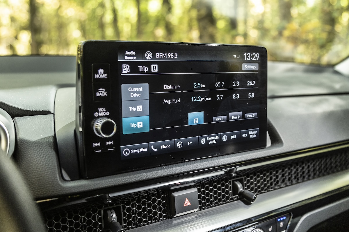 Conform computerului de bord, am obținut un consum de 5,2 l/100 km la mers lejer (dar cu A/C) și cam 6,5 l/100 km când am părăsit modul Eco, am trecut de Normal și am ajuns în Sport. Este aproape de consumul lui Civic (model mai ușor și mai aerodinamic). Explicația ar putea fi adaptarea cutiei de viteze, care a primit un al doilea raport, folosit atunci când motorul termic antrenează roțile. Nu simți schimbările de treaptă, totul funcționează lin și cele trei niveluri de recuperare, selectabile de la padelele din spatele volanului, ajută mult la obținerea unor consumuri reduse.