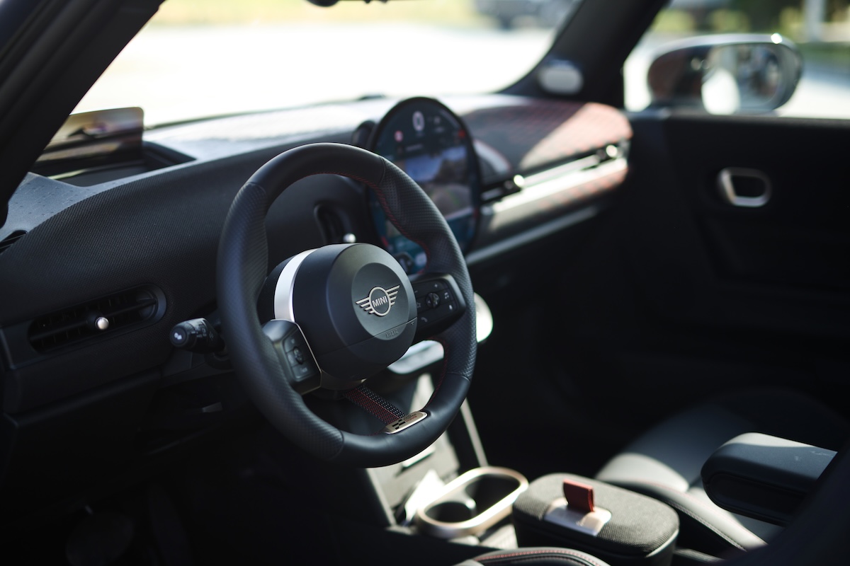 Prețul pornește de la 31.654 de euro, dar cu echiparea de top, John Cooper Works, pe care o avem și noi, mai ai nevoie de aproape 7100. Primești o parte frontală cu inserții negre lucioase, grilă diferită, jante JCW de 17 inchi, scaune sport cu piele Vescin și material textil, volan și frâne JCW.