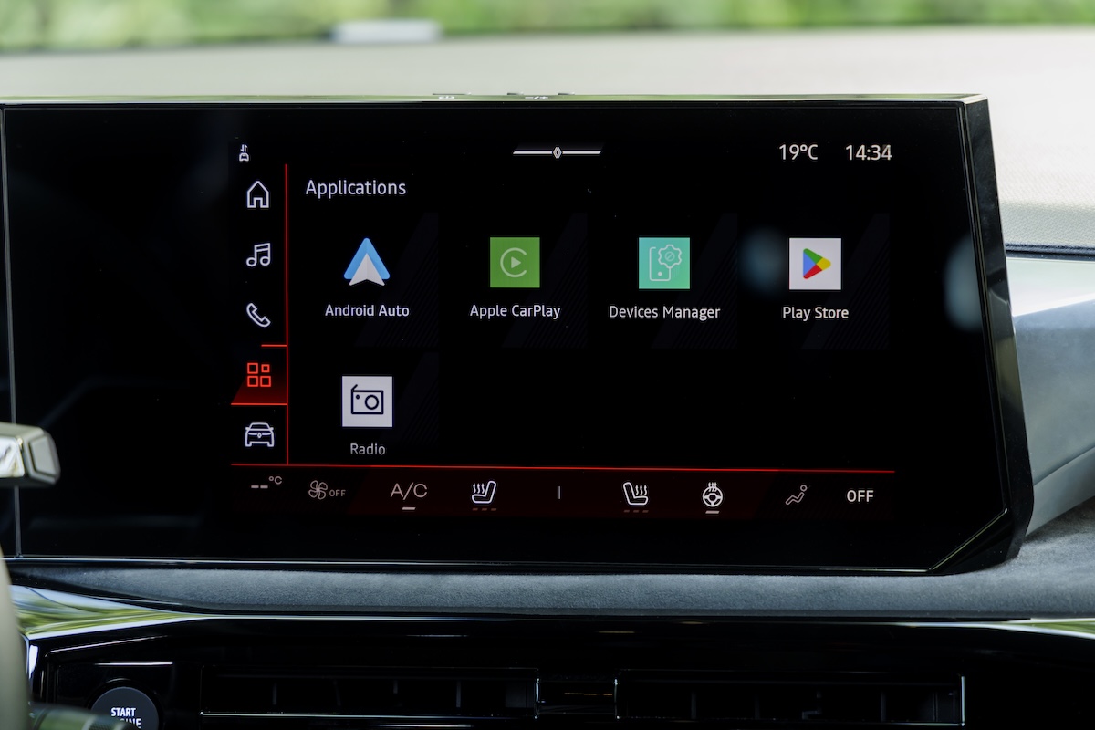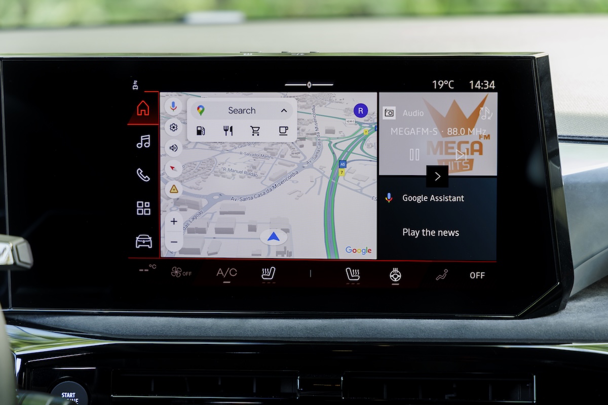 La interior, Renault a preferat să nu experimenteze prea mult, nu neapărat de teamă, ci mai ales din rațiuni economice. Astfel, volanul este cel pe care-l știm de la alte modele Renault, cu aceleași comenzi, iar în spatele său este grupul format din cele două display-uri de 10,1 inchi, cel central fiind orientat către șofer. Tabloul de bord are structura cunoscută cu trei ferestre și culori vii, iar pe display-yl central rulează același Google Automotive, dar magazinul de aplicații a fost mărit, astfel că poți descărca până la 100 de aplicații, inclusiv de video streaming. Impecabil pe traseele de lângă Lisabona, unde am folosit doar Google Maps.