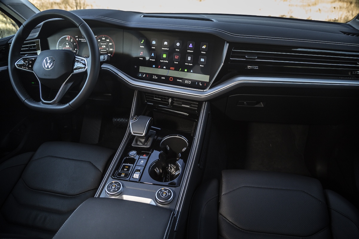 Prima dată când iei contact cu interiorul, ai senzația că totul e la fel. Dar nu este. E adevărat că n-au fost operate modificări de structură (VW Touareg avea deja tablou de bord digital), adică Innovision Cockpit, format din tabloul de bord (Digital Cockpit, 12 inchi) și sistemul de infotainment de 15 inchi (Discover Pro Max). Ce a făcut însă Volkswagen a fost să le îmbunătățească atât funcțional, cât și la nivelul graficii, și aici vezi imediat diferența: rezoluție mai bună, pictograme moderne, structură mai inspirată a diferitelor meniuri. Fiind ceva mai old school (dacă putem spune asta despre digitalizare), grafica este foarte relaxantă, cu fonturi mari, informații pe care le citești imediat, fără să le cauți într-un noian de afișaje. Dacă tot vorbeam de operabilitate, pe volan nu mai sunt butoane fizice, ci suprafețe tactile cu efect haptic enervante și dificil de folosit.