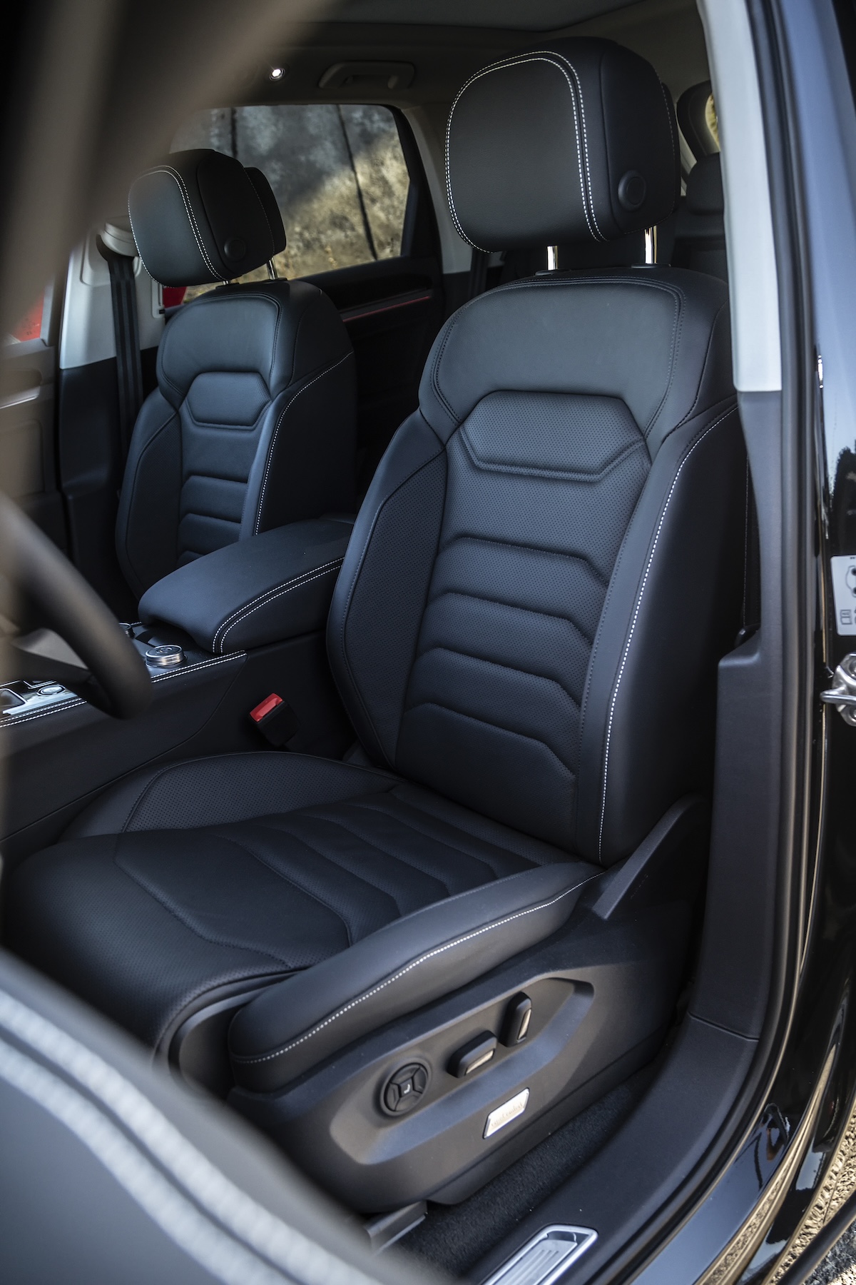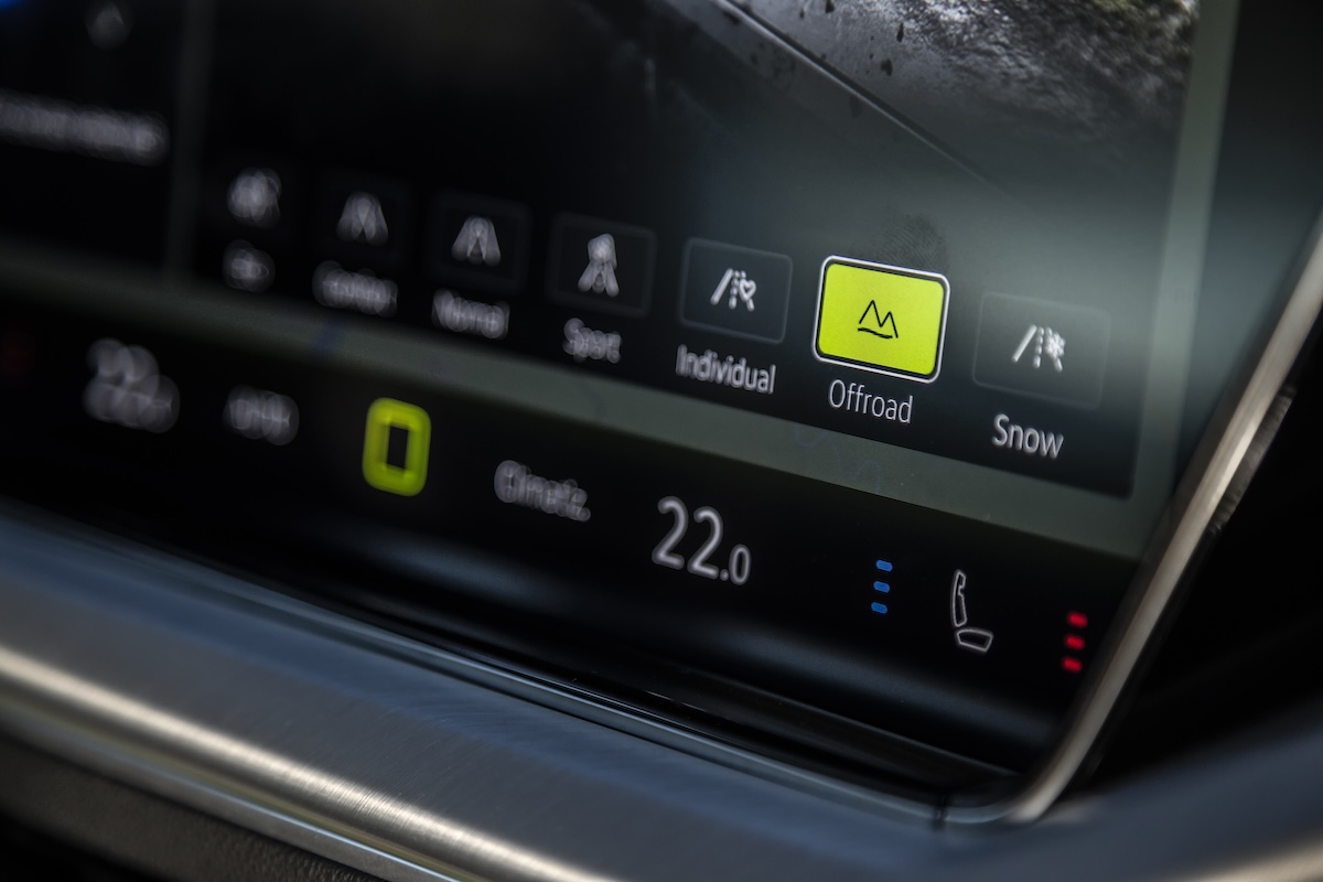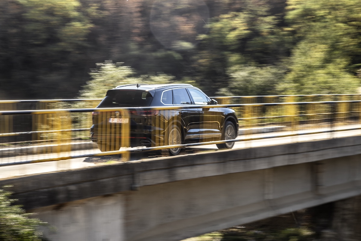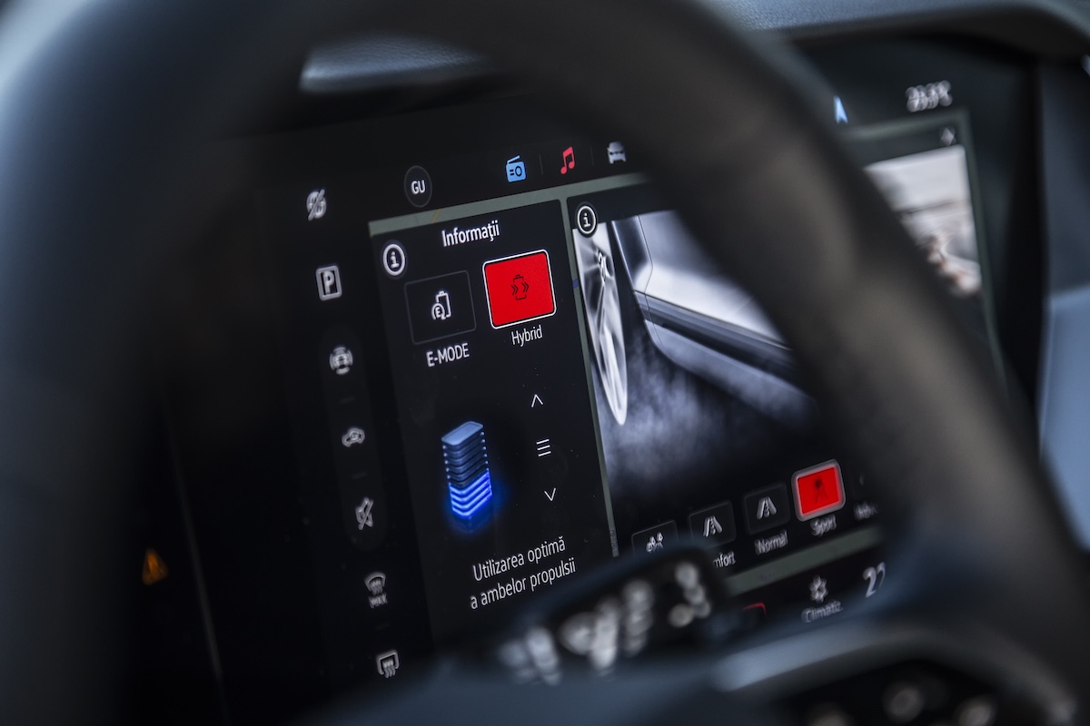 Suspensia pneumatică cu ajustare adaptivă contribuie mult la confort, în special la trecerea peste denivelări mai mici, dar costă 1904 euro. Evident, te ajută și în off-road, pentru că poți seta garda la sol, fie manual (butonul rotativ din dreapta, pe consolă), fie automat, în cadrul programelor de rulare (Eco, Normal, Comfort, Sport, Individual, Off-road și Snow) selectabile de la butonul rotativ din stânga. Consumul este normal raportat la cilindree și masă, cu bateria goală cam 11,5 l/100 km în extraurban, iar în oraș cel mai bine este să folosești modul Hybrid, asta pentru că VW nu a vrut să facă încărcarea bateriei mai rapidă – maximum 7,4 kW la AC, în condițiile în care sunt producători care oferă încărcare DC la PHEV-uri.