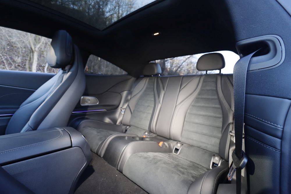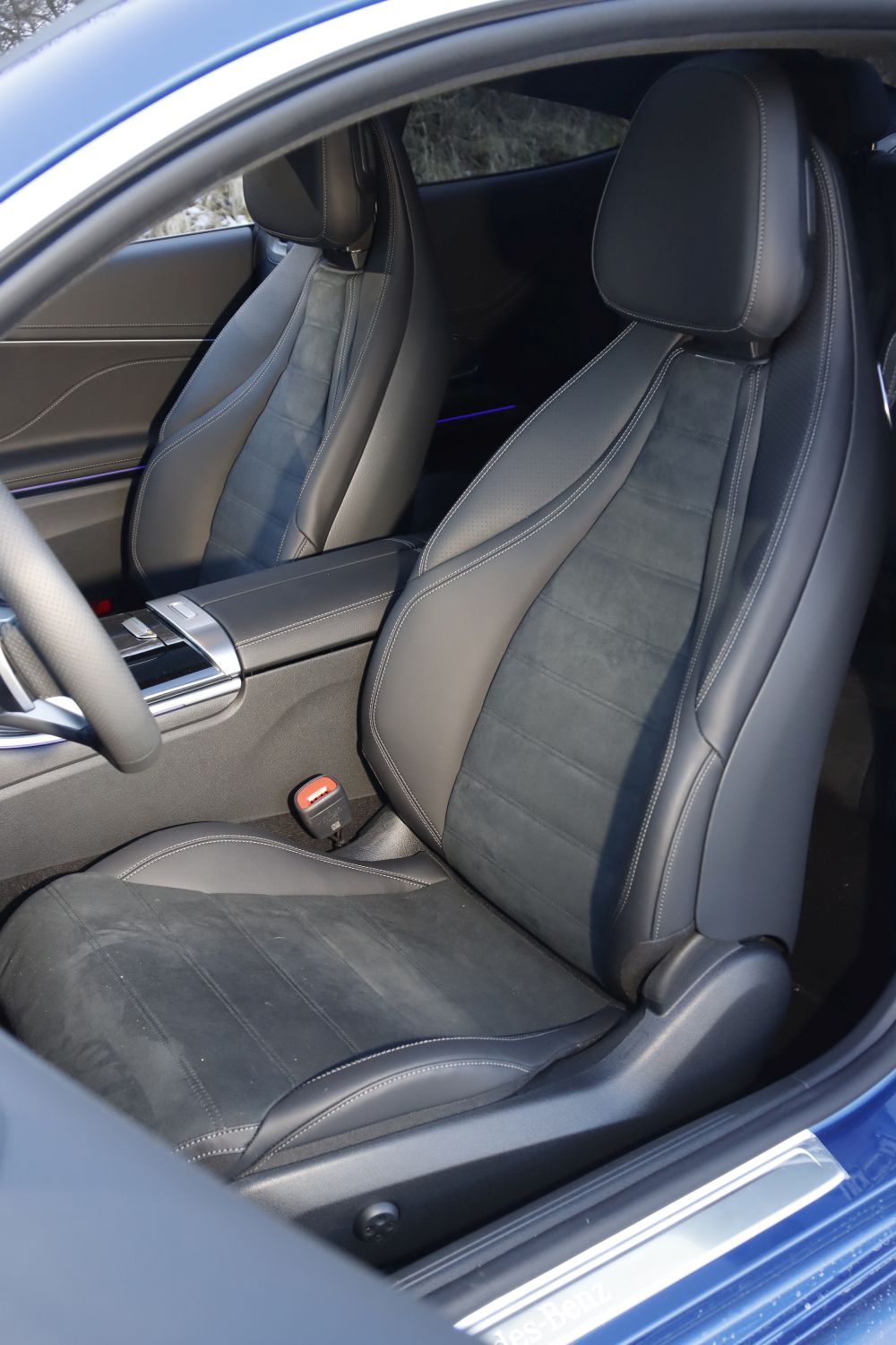 De asemenea, în spate e loc doar pentru două persoane, iar spătarul banchetei este puțin prea apropiat de verticală. Ne consolăm cu faptul că bancheta e bine profilată, dar suprafața vitrată mică și spațiul îngust nu sunt propice pentru călătorii pe distanțe lungi, deși CLE este un coupé cu patru locuri full-size. Bancheta se rabatează doar din interior, oferind acces la un portbagaj de 420 de litri, cu 20 mai mic decât cel de la BMW Seria 4. În schimb, în față stai într-o poziție joasă, pe scaune sport cu susținere laterală excelentă și tetiere integrate, dar reglabile, îmbrăcate standard în piele Artico (sintetică) neagră și microfibră tot neagră.