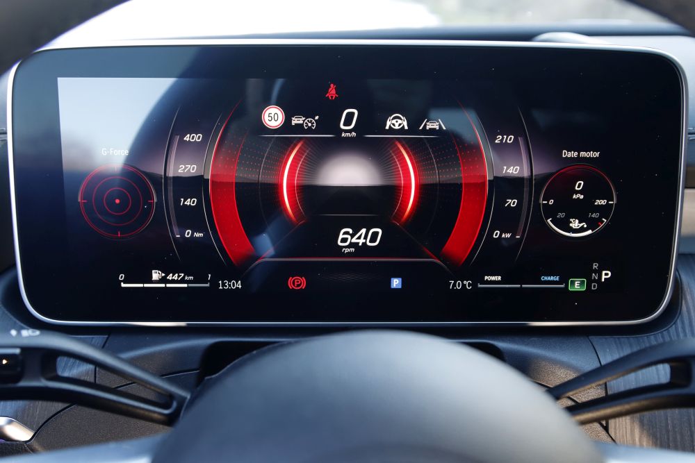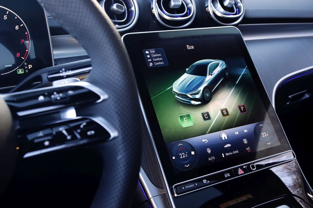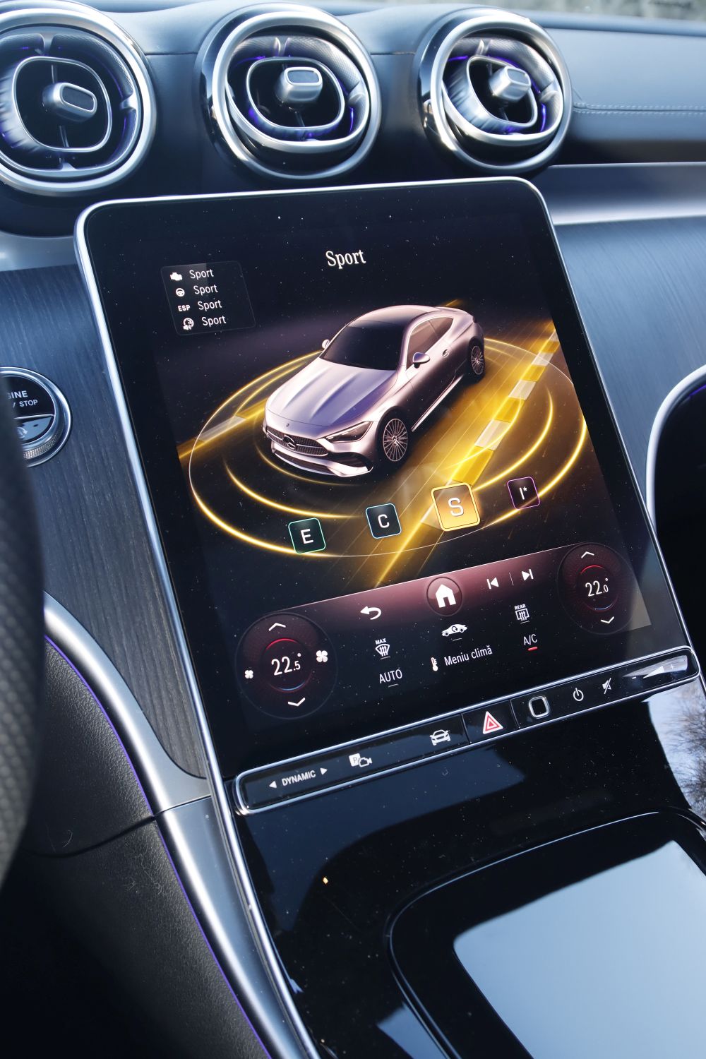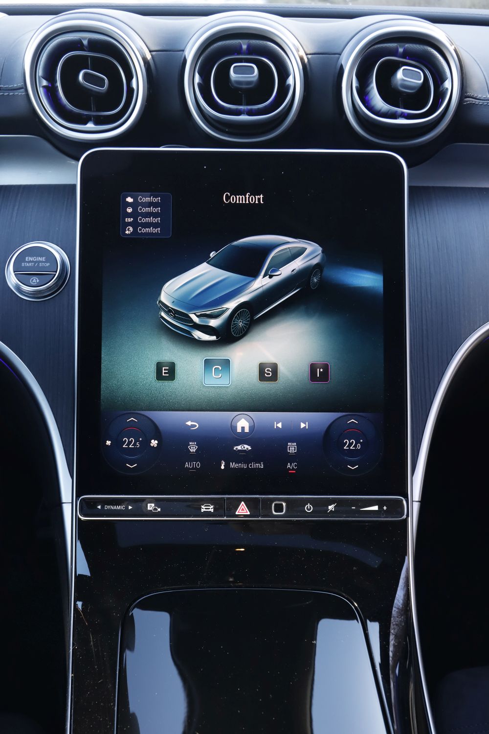 De aceea, regăsim aceeași grafică pentru indicatoarele de bord digitale, același volan cu minisuprafețe tactile, același head-up display și același modern sistem multimedia MBUX, care este intuitiv și ușor de operat. Între scaunele din față tronează un tunel median înalt, cu multe spații pentru depozitare, două prize USB-C, iar la baza displayului multimedia, regăsim butoanele cu feedback haptic pentru trenul de rulare, accesul la climă și volumul audio.