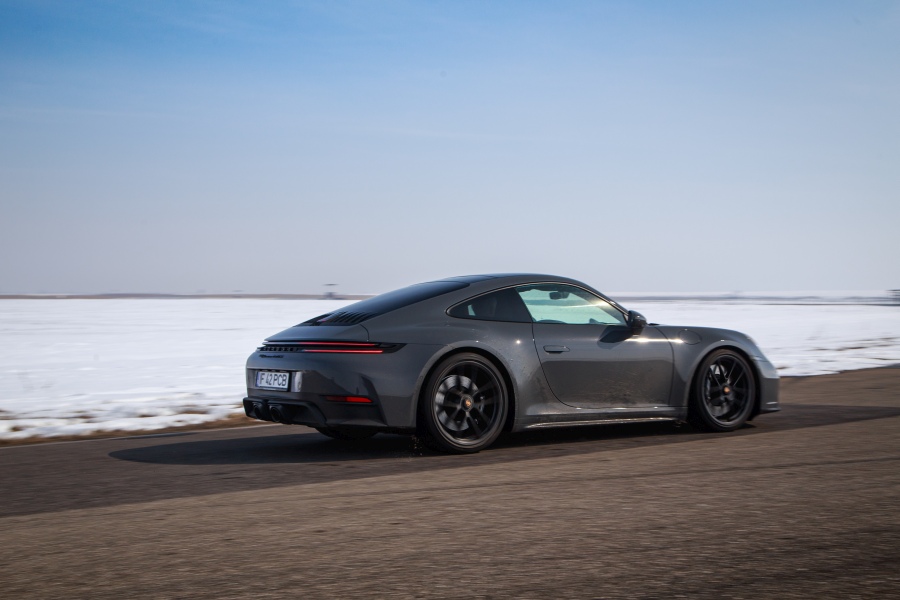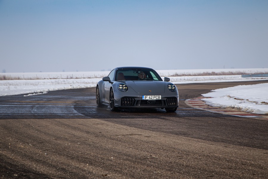 Direcția Servo Plus (313 euro) este ca la orice alt 911, fabuloasă. Nici prea ușoară, nici prea grea, cu un feedback excelent, care îți dă tot timpul informații despre cât de mult ai rotit volanul. Aderența pe spate? Senzațională cu pneurile late de 315. Deoarece cele 50 kg suplimentare au fost distribuite aproape uniform în față și în spate, 911 GTS e la fel de dinamic ca orice alt 911. Cât ne-a permis circuitul MotorPark România în condiții de iarnă, ne-am putut bucura de dinamica de excepție. 911 intră neutru în curbe, cu o subvirare aproape neînsemnată, iar la apăsarea accelerației la ieșirea din viraj, spatele împinge cu vigoare, fără a rupe aderența, limitele fiind împinse departe datorită inclusiv direcției integrale. De aceea, comportamentul în domeniile-limită este și mai intuitiv, dar și sigur în același timp.