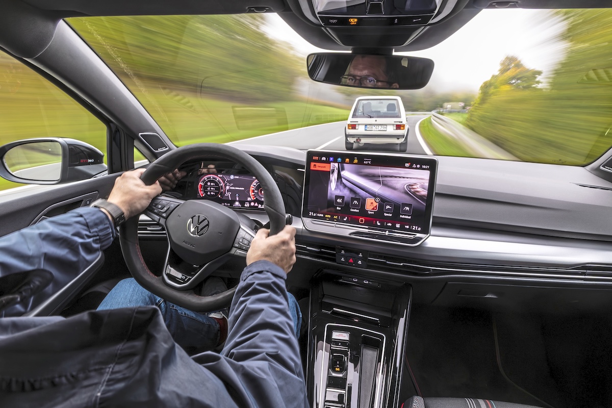Da, asta e! Pomii fructiferi se succed în viteză. Relieful urcă și coboară, câmpuri, pajiști, undeva o șosea îngustă. Acul vitezometrului stă la o sută, treapta a patra, turometrul pe la 3300. Curba de dreapta peste creastă — mașina se lasă ușor pe stânga. Piciorul se ridică pentru o clipă de pe accelerație, apoi și spatele Golf-ului devine ușor. Anvelopele mici, pe jante de 13 inchi, încep să murmure fin, iar peste creastă mașina trece prin curbă ca purtată de un val, ca și cum ar pluti o clipă înainte de desprindere. Așa se simte — aproape fără greutate, dar ținută de două mâini pe un volan subțire, într-un echilibru fragil. Și asta e! Un sentiment frumos — nu, unul înălțător, amețitor: acesta este senzația GTI.